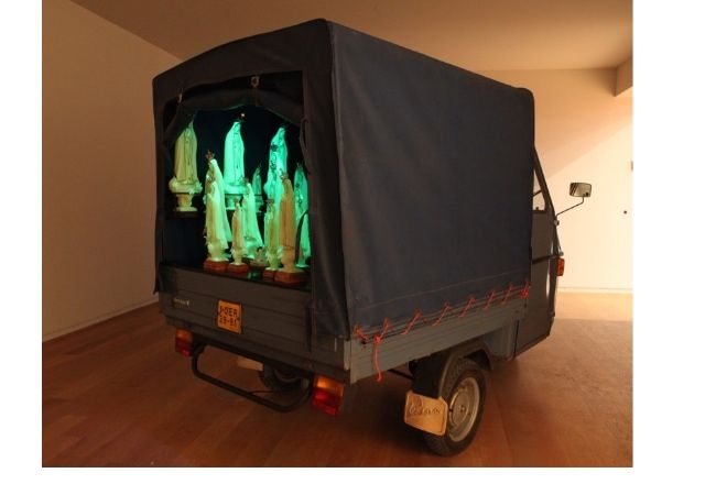 Joana Vasconcelos (1971) www.fatimashop, 2002. Piaggio APE50, luminous statues of Our Lady of Fatima, ultraviolet light bulb, painted MDF, timer Video projection: Gone Shopping (Fui às Compras) mini-DV transferred to digital, PAL, 4:3, color, sound, 33 min. Piaggio: 167 x 123 x 265 cm. Projection: 3 m large (proportional height) Fondation Louis Vuitton, ParisJoana Vasconcelos. www.fatimashop, 2002 / Photo: © Manchester Art Gallery © Joana Vasconcelos, VEGAP, Málaga, 2025