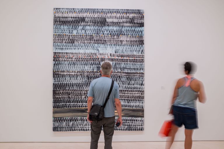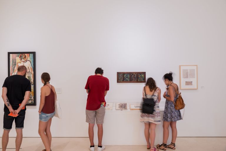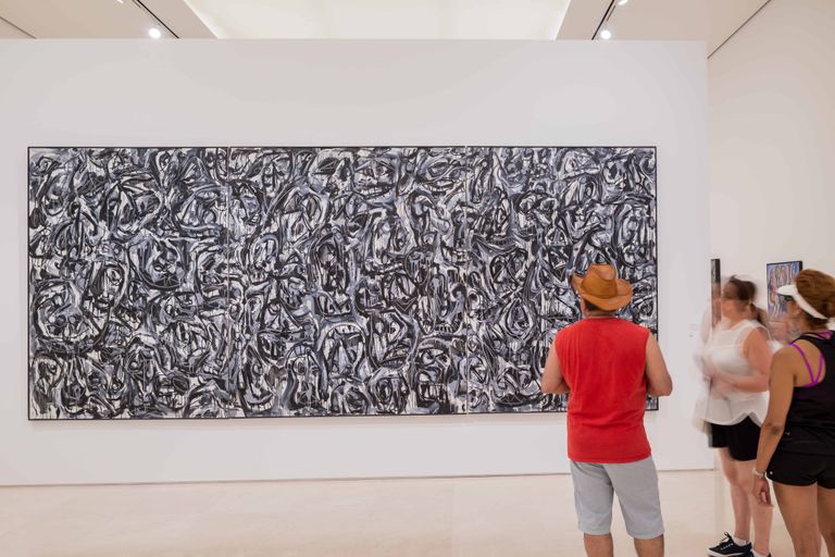 Visitantes frente a La grande foule [La gran muchedumbre] de Antonio Saura, 1963. Foto: Jesús Domínguez ©Museo Picasso Málaga